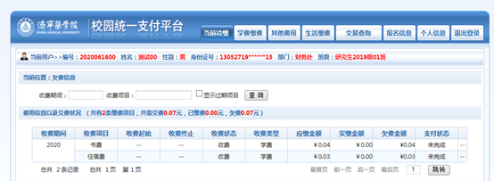 登錄后,在“當(dāng)前待繳”界面將顯示當(dāng)前登陸用戶的欠費(fèi)項(xiàng)目及明細(xì)